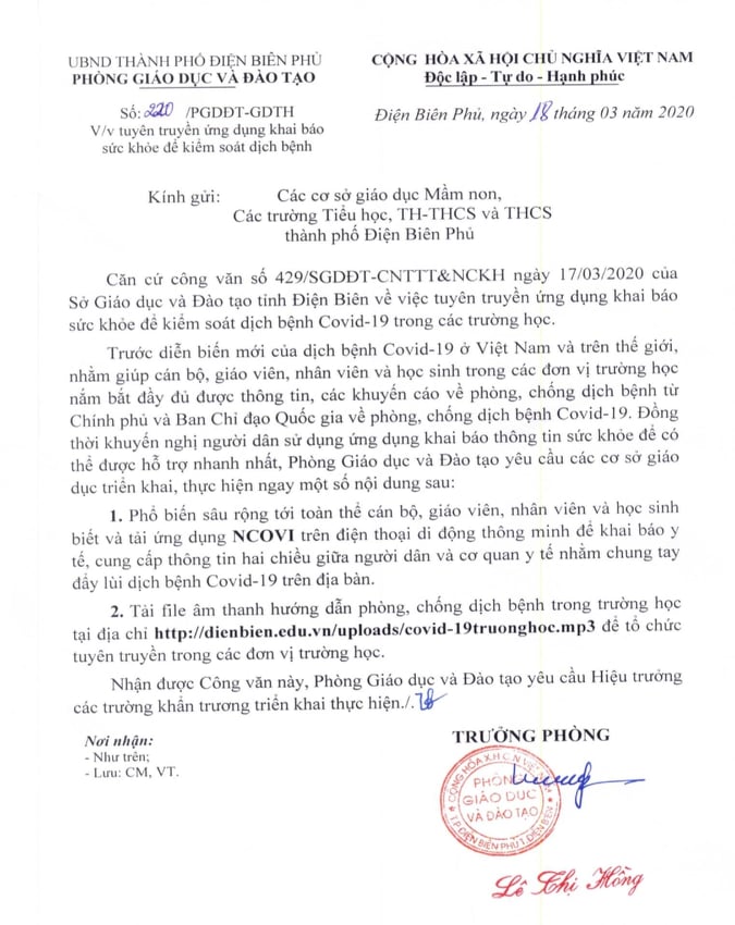 CBGVNV trong nhà trường tải ứng dụng NCOVI trên điện thoại di động thông minh theo CV số 220/PGD ĐT –GDTH ngày 18/3/2020 của Phòng GD ĐT TP Điện Biên Phủ để khai báo thông tin y tế cung cấp thông tin 2 chiều giữa người dân và cơ quan y tế nhằm chung tay đẩy lùi dịch bệnh covid 19 trên địa bàn. Tải file âm thanh hướng dẫn phòng chống dịch bệnh trong trường học tại địa chỉ http://dienbien.edu.vn/uploads/covid-19truonghoc.mp3 để tuyên truyền tới phụ huynh, học sinh.