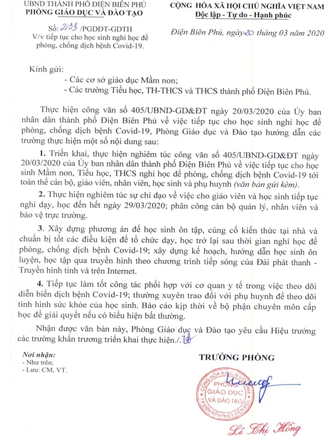 Thực hiện công văn số 233/PGDĐT-GDTH ngày 20/3/2020 của Phòng GD ĐT thành phố Điện Biên Phủ về việc tiếp tục cho học sinh nghỉ học để phòng chống dịch bệnh Covid 19. Trường mầm non Noong Bua thông báo một số nội dung sau: