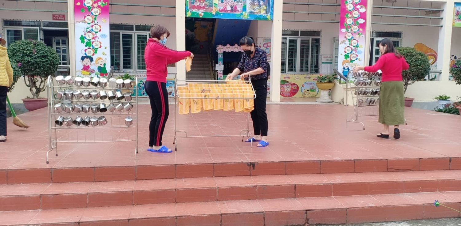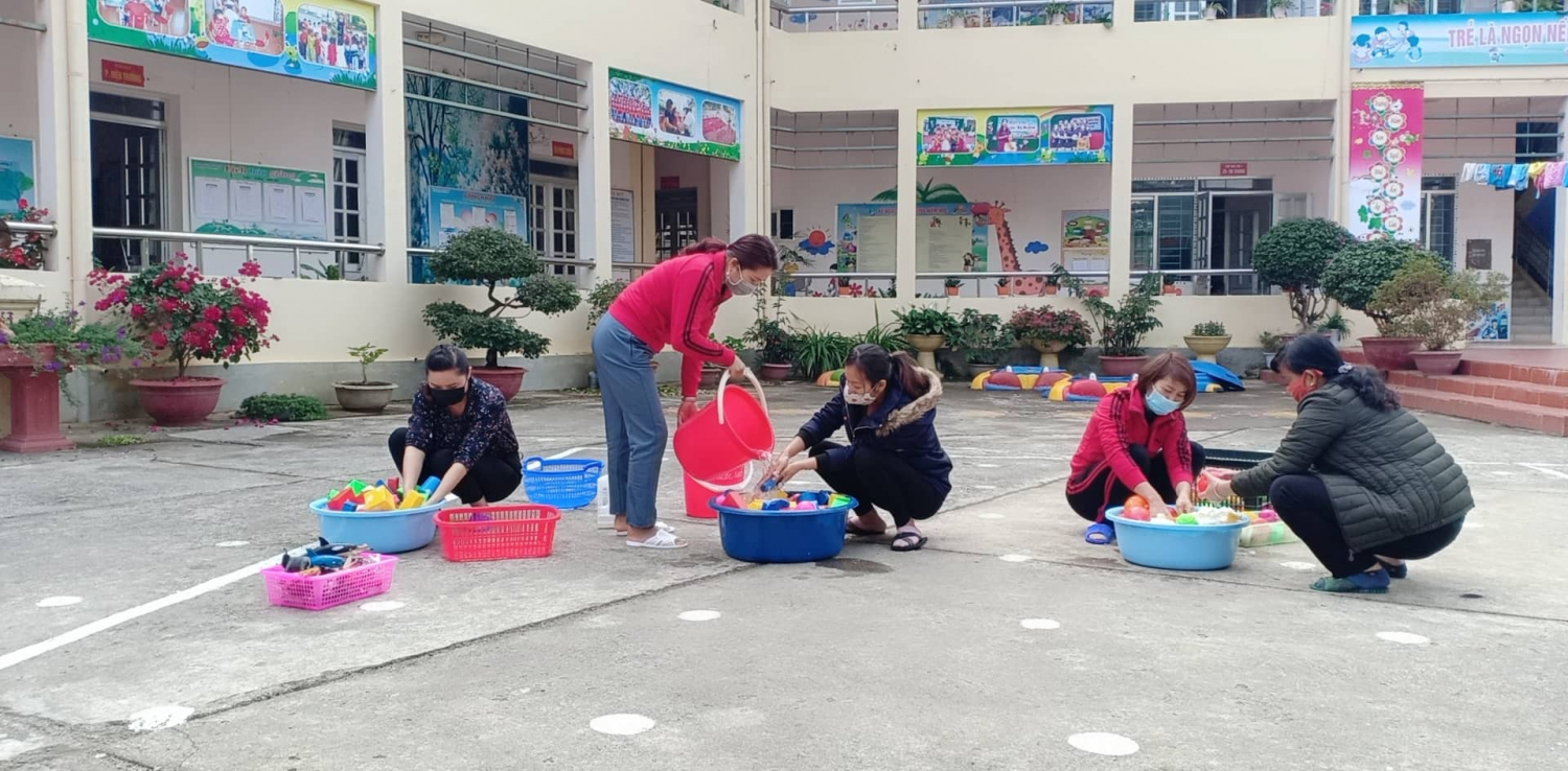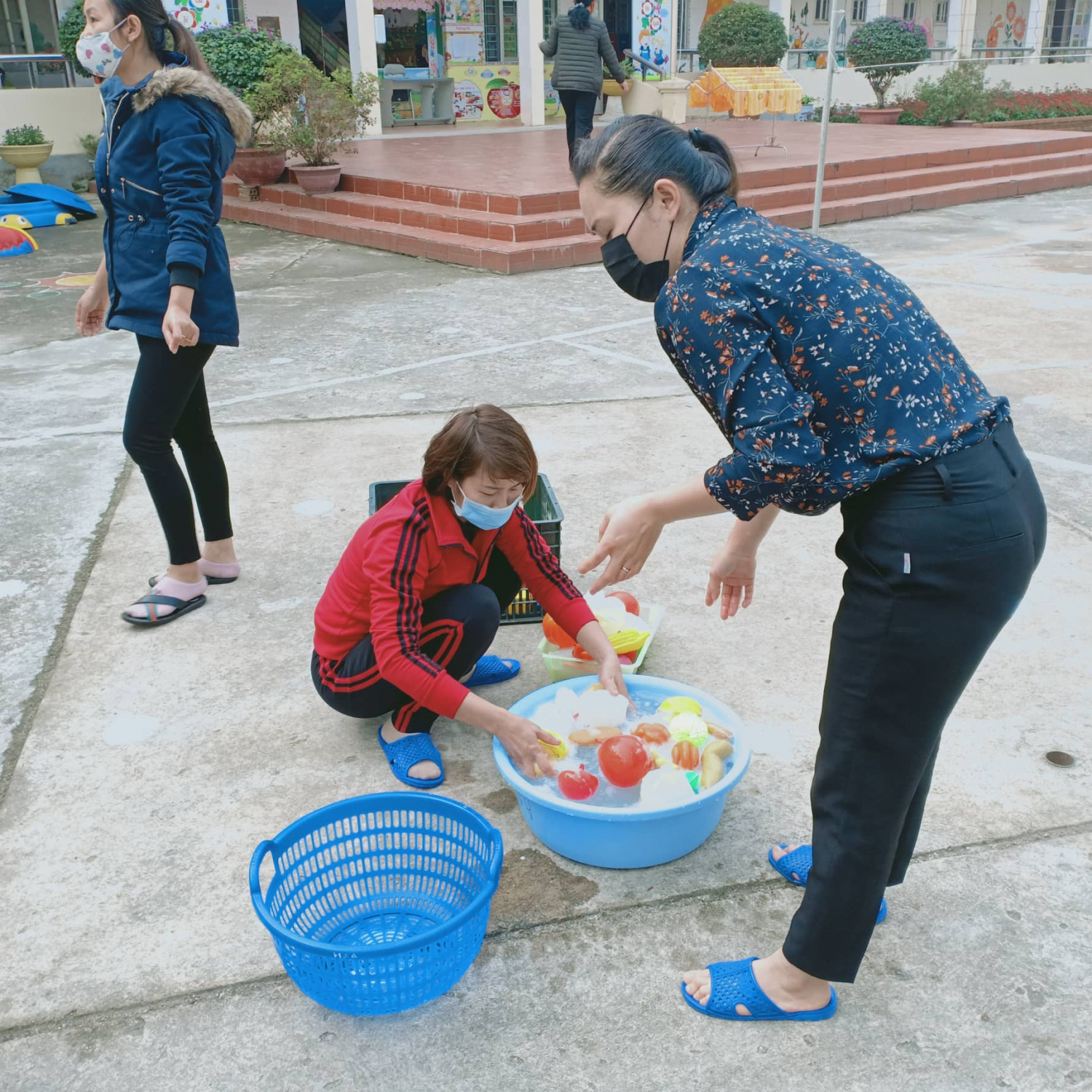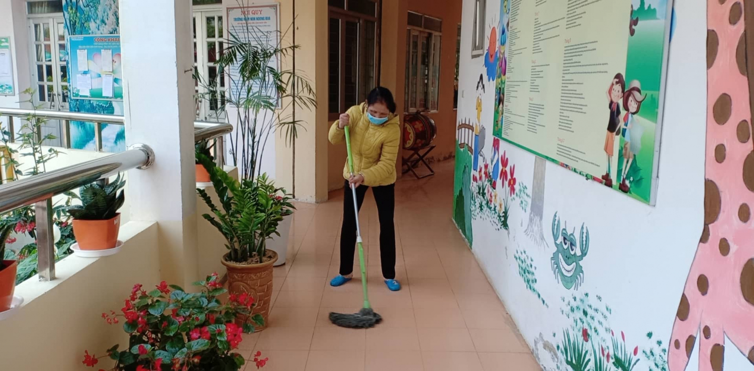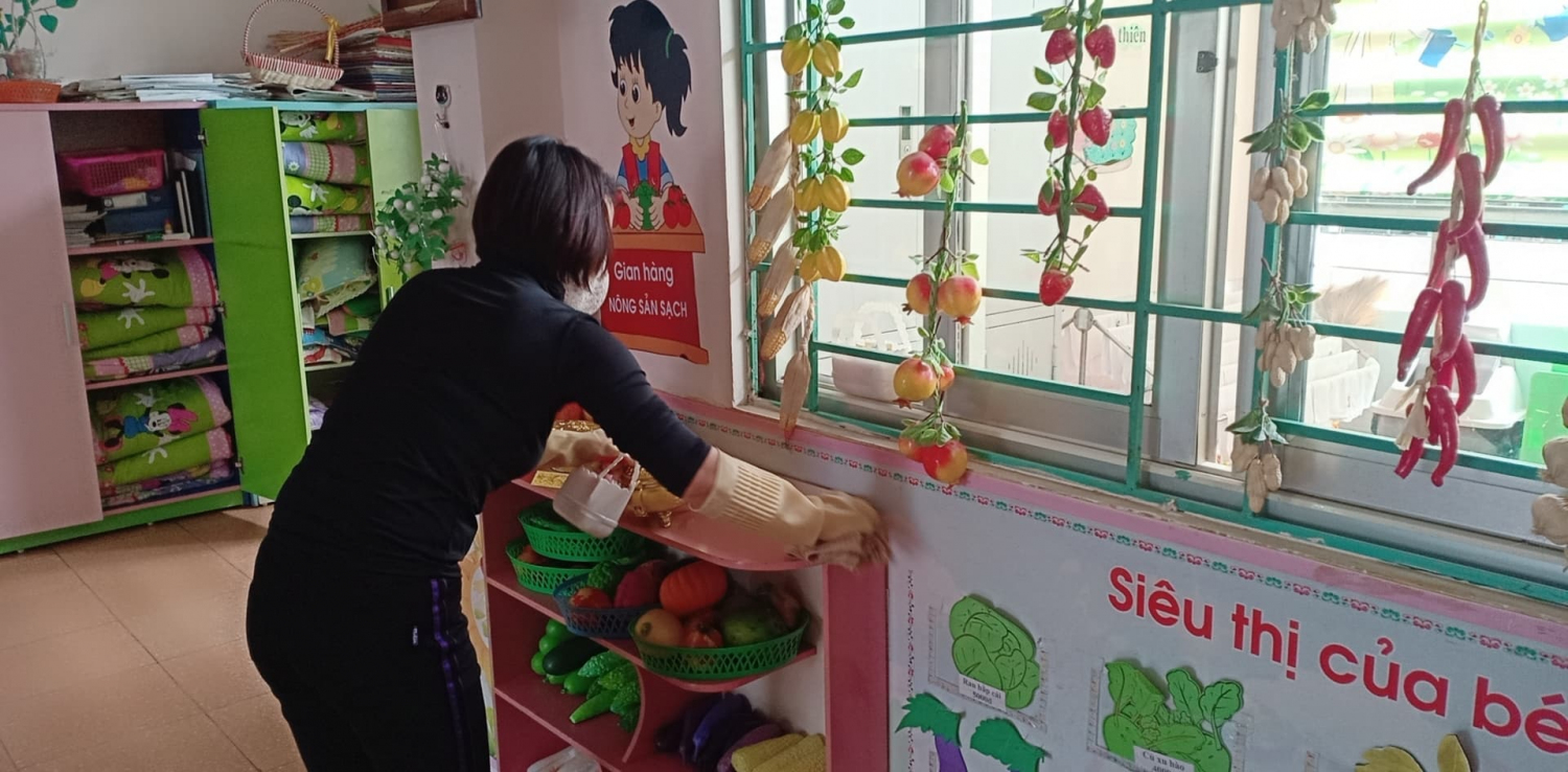 Bên cạnh đó nhà trường cũng chỉ đạo toàn trường thực hiện tổng vệ sinh toàn bộ các khu vực trong và ngoài lớp học đặc biệt là những đồ dùng đồ chơi, bàn ghế, tay nắm cửa, đồ dùng ăn uống. Thông thoáng lớp học, lau chùi rửa đồ chơi ngoài trời…Hướng dẫn cán bộ giáo viên, nhân viên và học sinh và tuyên truyền cho phụ huynh các biện pháp phòng dịch như: Giữ ấm cơ thể cho bé; giữ gìn vệ sinh cá nhân trẻ và vệ sinh phòng, nhóm, đồ dùng đồ chơi theo đúng quy định; Thực hiện ăn chín, uống sôi, ăn đủ chất dinh dưỡng, tăng cường uống vitamin C ( nước cam, nước chanh….) để tăng cường sức đề kháng cho cơ thể của trẻ; Chủ động sử dụng khẩu trang y tế, đeo khẩu trang y tế đúng cách nhất là khi cho trẻ đến chỗ đông người, hạn chế đến, tụ tập chỗ đông người; Khi trẻ có dấu hiệu ho, sốt, khó thở cần liên hệ ngay với các trung tâm y tế để được tư vấn, khám và điều trị; Không để trẻ tiếp xúc với người có biểu hiện cúm; Nhắc nhở trẻ che miệng, mũi khi hắt hơi, ho; Đeo khẩu trang y tế đúng cách nơi công cộng.
